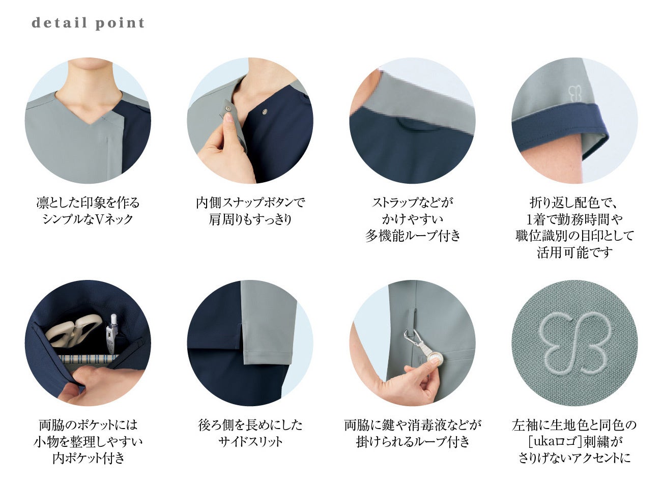 今回のバイカラースクラブは、お客様からお寄せいただいたご要望を受け、男女問わず着用いただける脱ぎ着しやすいジップアップタイプのスクラブです。