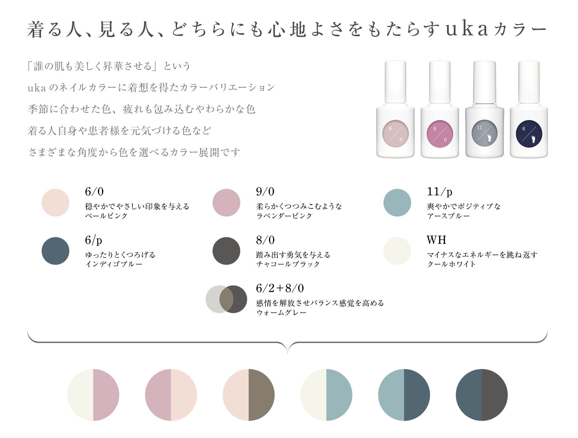 「誰の肌も美しく昇華させる」というukaのネイルカラーに着想を得たカラーバリエーションをベースに、6パターンの組み合わせをご用意しました。季節やその日の気分に合わせて選んでいただくことができ、着る人、見る人、どちらにも心地よさをもたらすカラー展開となっております。