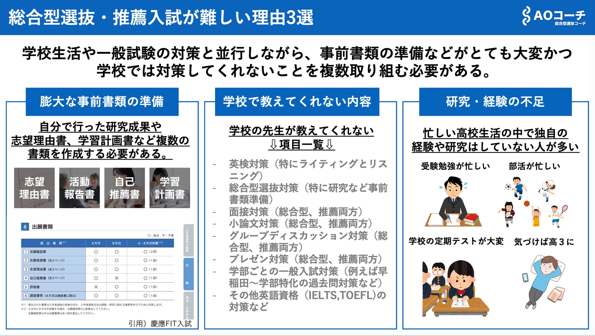 AOコーチ(総合型選抜コーチ)では、こうした準備を学校生活や一般入試対策と並行して進めることに難しさを感じる受験生が多いと考えています。