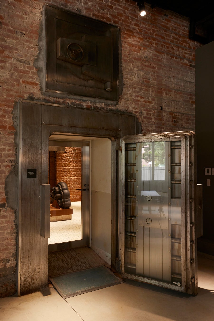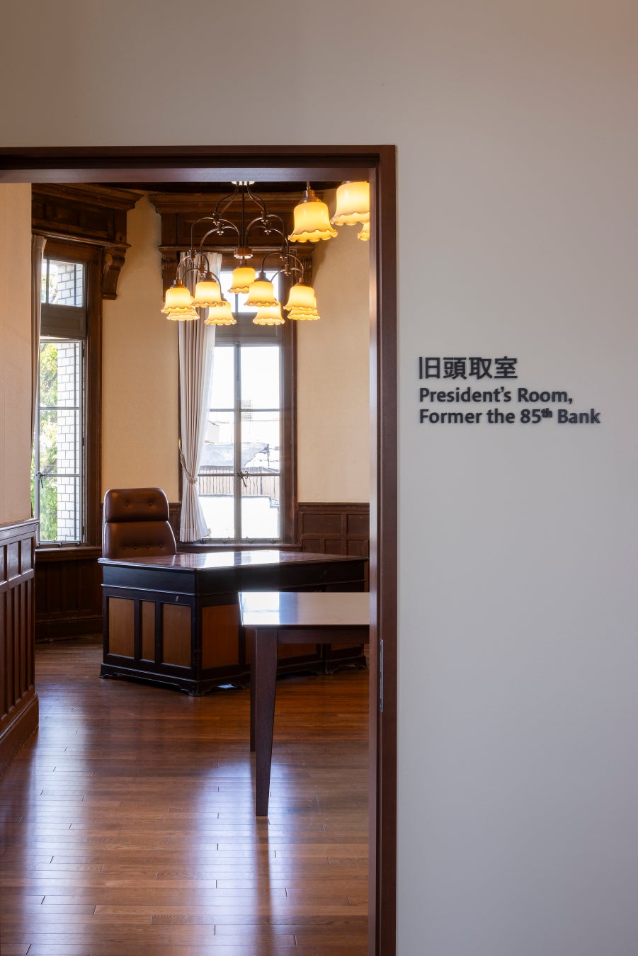 創建時の記憶の継承と復元:天井裏に隠ぺいされていたアーチスラブなど現し、旧金庫室は構造体の煉瓦を斫り出しギャラリーやレストラン、旧頭取室は創建時の意匠を復元し、観光客が自由に見学可能なスポットを兼ねた空間へ転用した。
