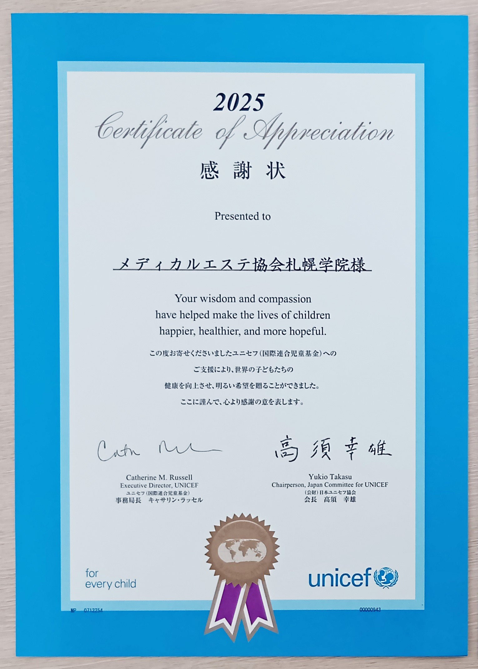 一般社団法人メディカルエステ協会(本部:東京都中央区、代表理事:西尾眞樹子)の教育機関の一つである「メディカルエステ協会 札幌学院長 鈴木肇氏」は、長年にわたる日本ユニセフ協会への寄付活動が認められ、この度、感謝状を授与されましたことをお知らせいたします。