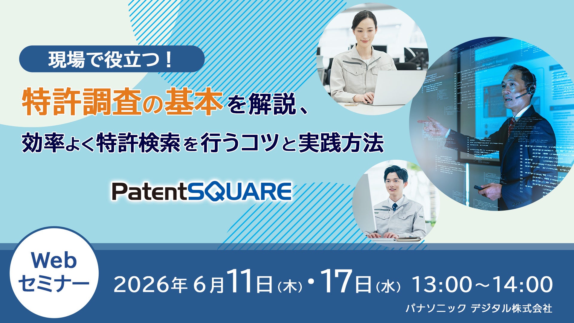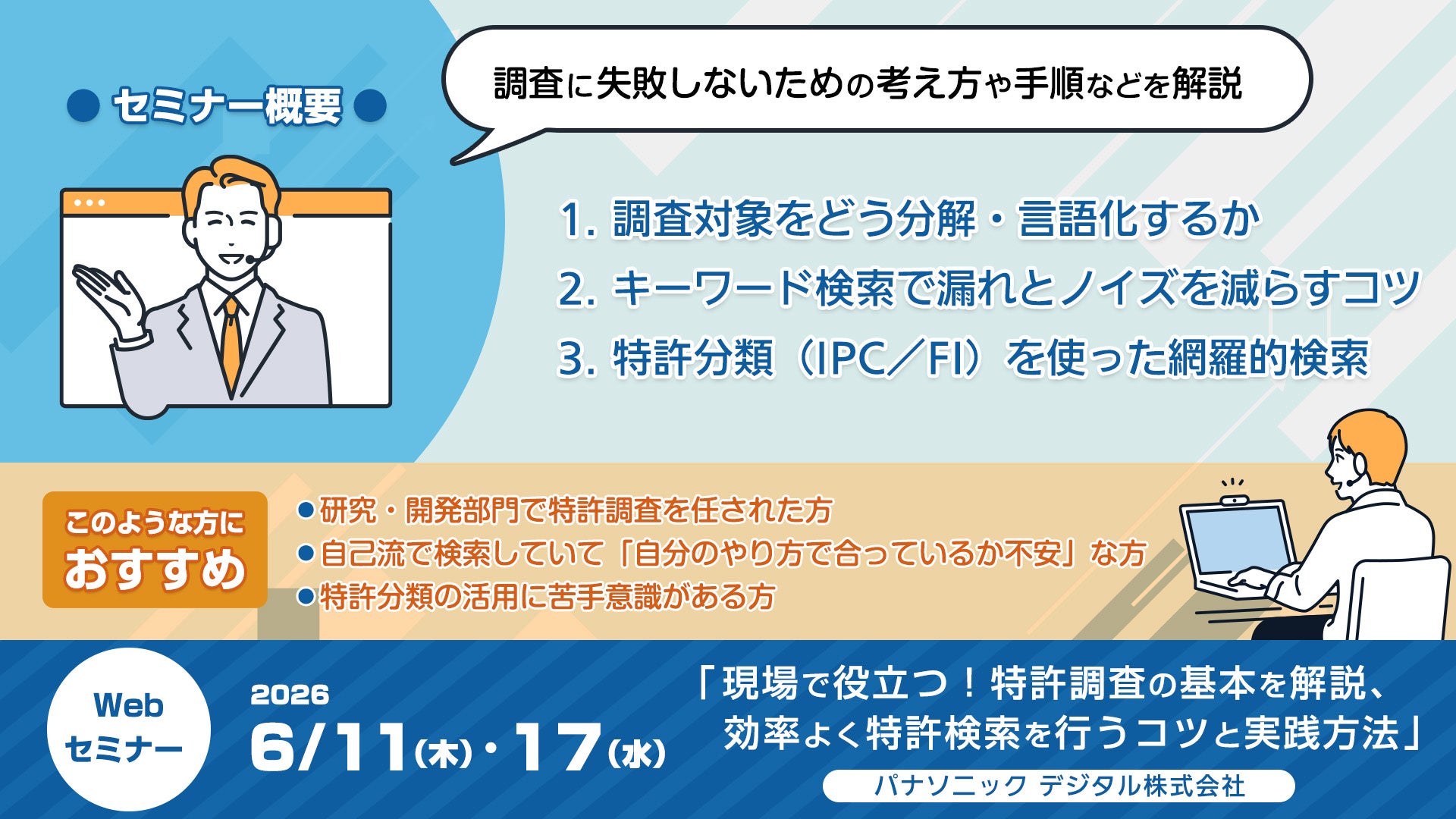 パナソニック デジタル株式会社(本社:大阪府、代表取締役 社長執行役員:阿部 裕)はこの度、Webセミナー「現場で役立つ!特許調査の基本を解説、効率よく特許検索を行うコツと実践方法」を開催します。研究・開発や知的財産業務において欠かせない「特許調査」。一方で、「検索漏れがないか不安」「ヒット件数が多すぎて査読が追いつかない」といった課題を抱える担当者も少なくありません。こうした課題を背景に、特許調査の基本的な考え方から具体的な検索手法までを解説する無料Webセミナーを2026年6月11日(木)、6月17日(水)に開催します。