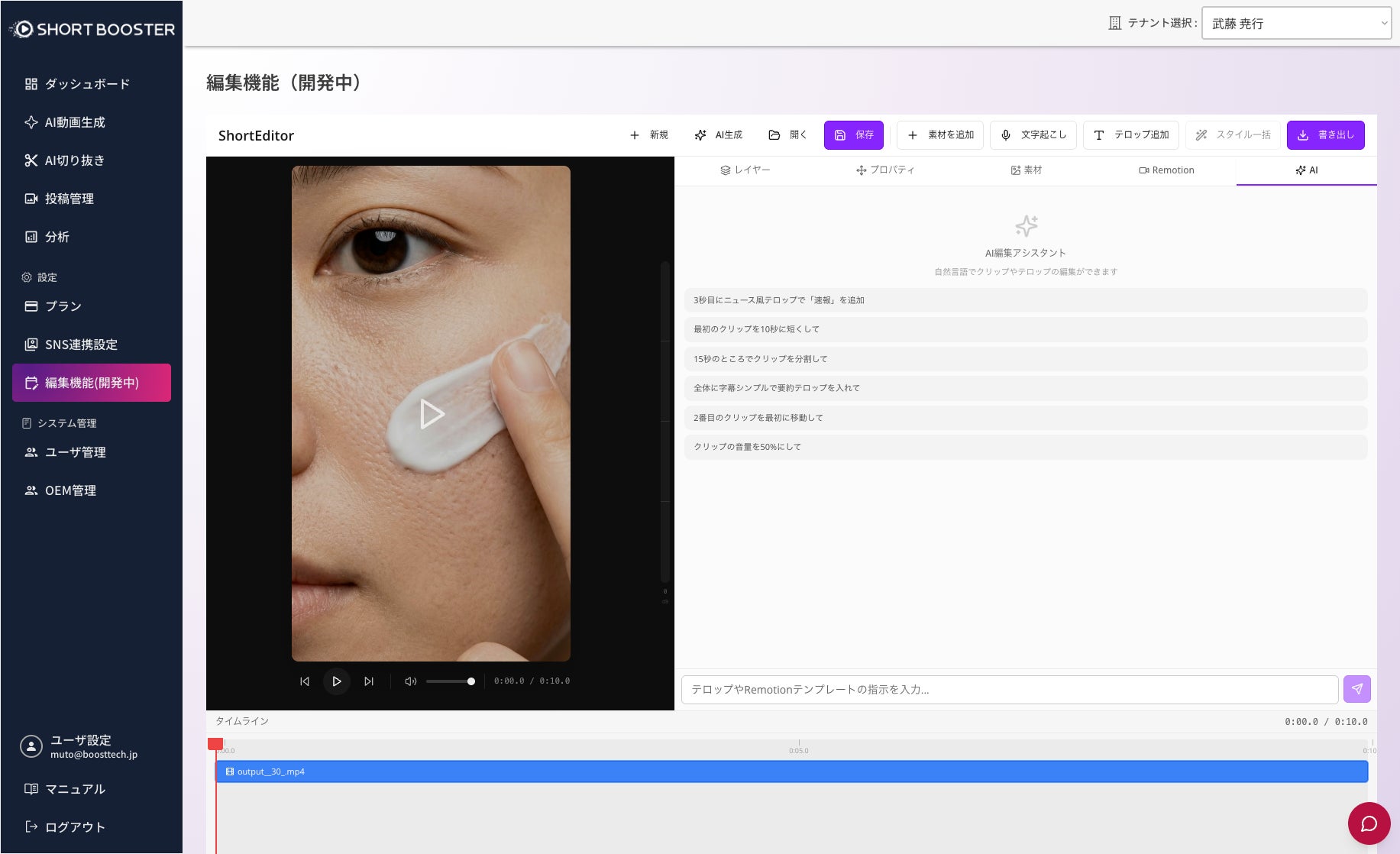 BOOSTTECH株式会社(本社:東京都新宿区、代表取締役:武藤 尭行、以下「当社」)は、AI縦型ショート動画生成・多媒体配信プラットフォーム「SHORTBOOSTER(ショートブースター)」において、Remotionテンプレートおよび各種素材(画像・動画・音楽など)をアップロードし、自然言語のテキスト指示だけで動画の編集・生成が完結する新機能「AI編集アシスタント」を、2026年4月14日より提供開始しました。