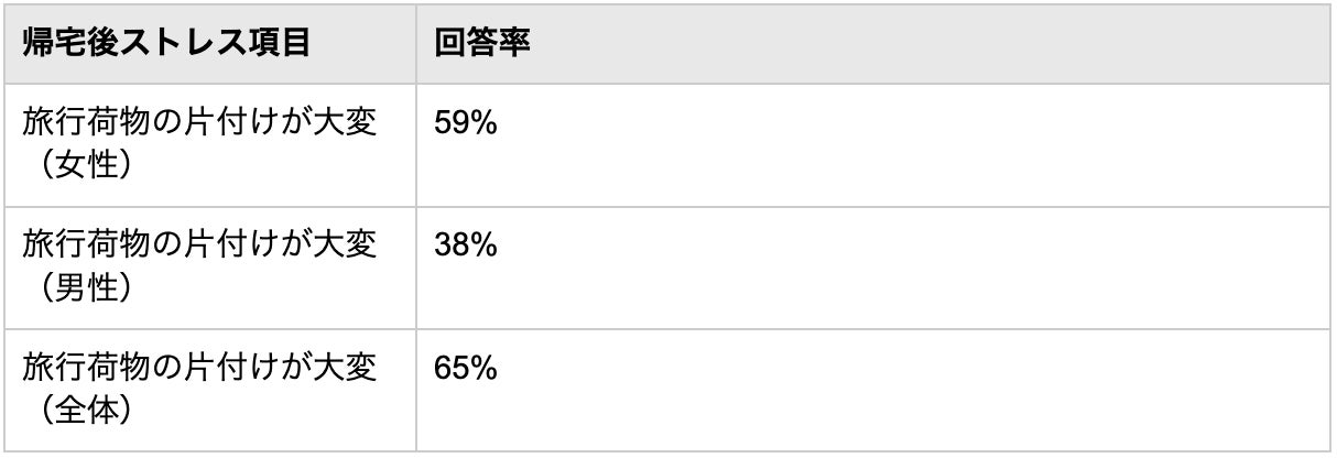 いこーよ総研の調査によれば、0〜1歳児のいる家庭では、家族旅行全般で“準備する荷物の多さ”にストレスを感じている割合が高く、旅行の“後”にもストレスが続くことが示されています。帰宅後の「旅行荷物の片付けが大変」は、女性の59%・男性の38%が挙げています(全体では65%)。