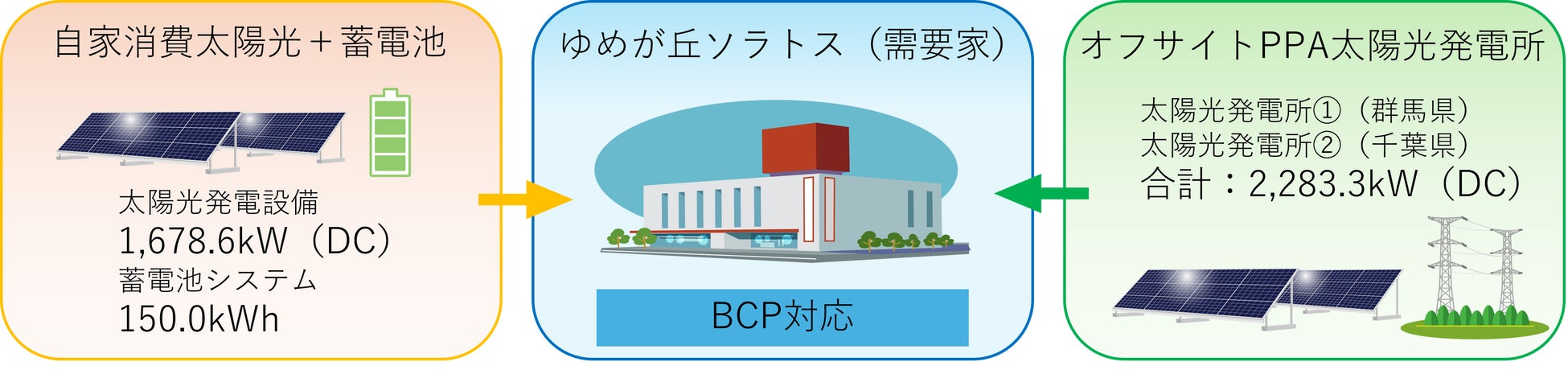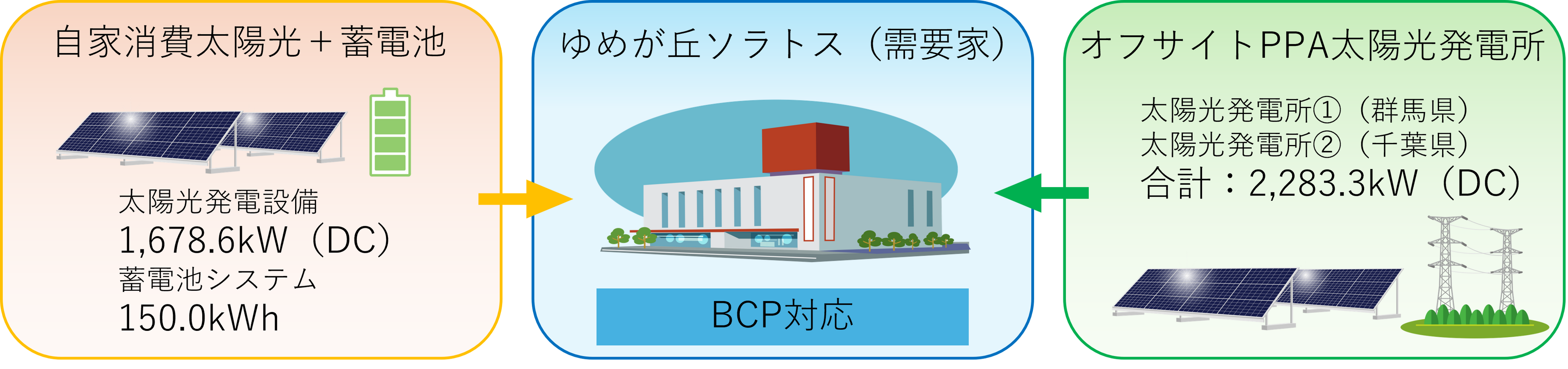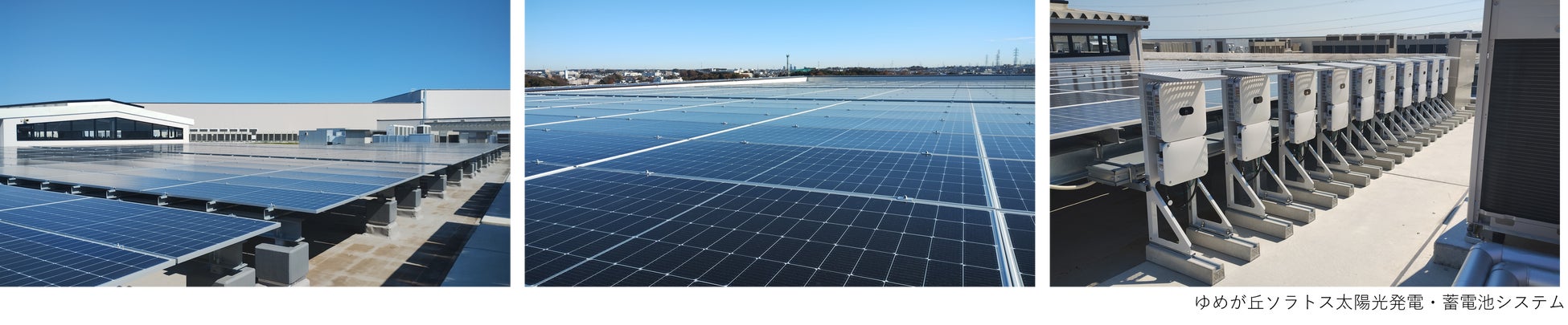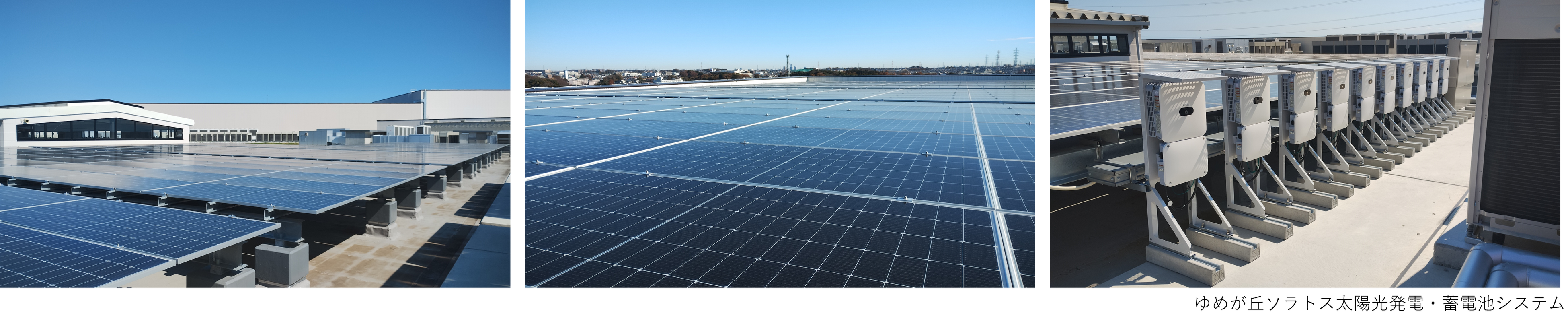 ゆめが丘ソラトスには自家消費型太陽光発電システムおよび蓄電池システムを導入し、オンサイトで発電した電力を施設内で活用しています。加えて、群馬県および千葉県におけるオフサイトPPA(フィジカル)による太陽光発電所2件で発電された電力についても、再生可能エネルギー電力として同施設に供給されます。これらの取り組みにより、ゆめが丘ソラトスにおける再生可能エネルギーの利用拡大を実現しています。