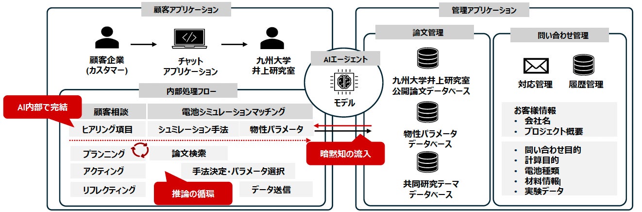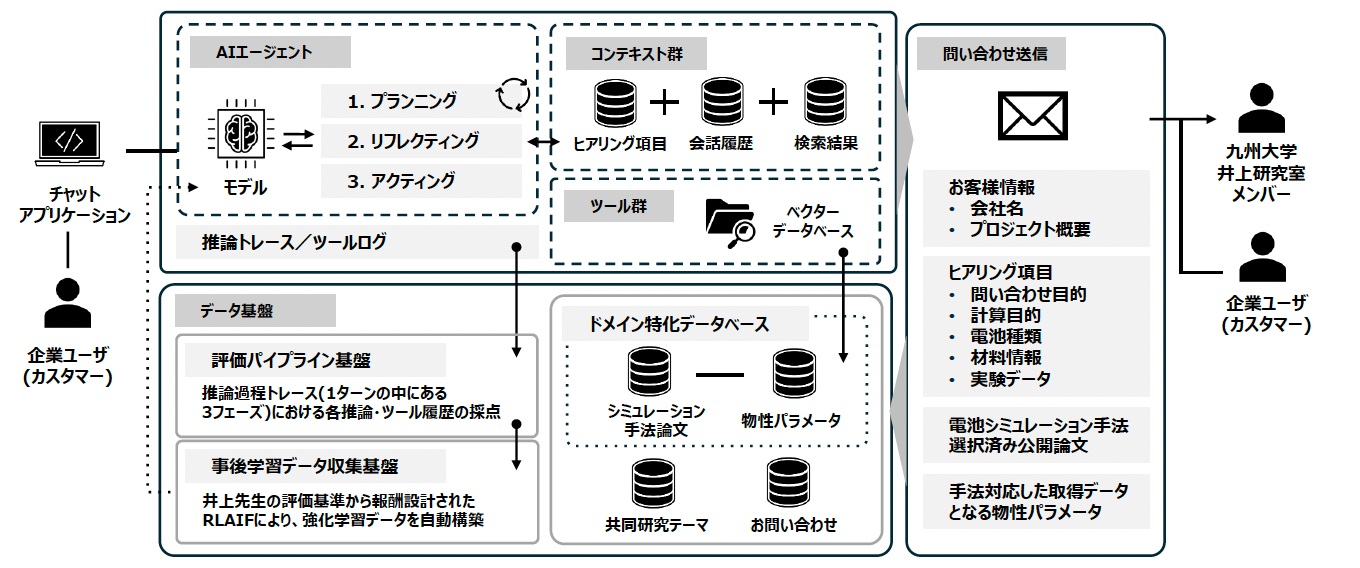 本AIエージェントは、井上研究室の暗黙知を搭載した自律的推論システムで、顧客アプリケーションと研究室向け管理アプリを統合し、ユーザーの曖昧な要求に対し、Plan-Act-Reflectの自律的思考ループによって、専門家と同等品質の計算条件(要件)定義を論理的に自動生成する。