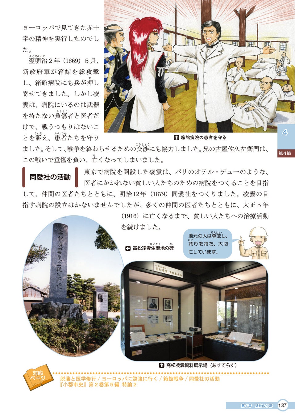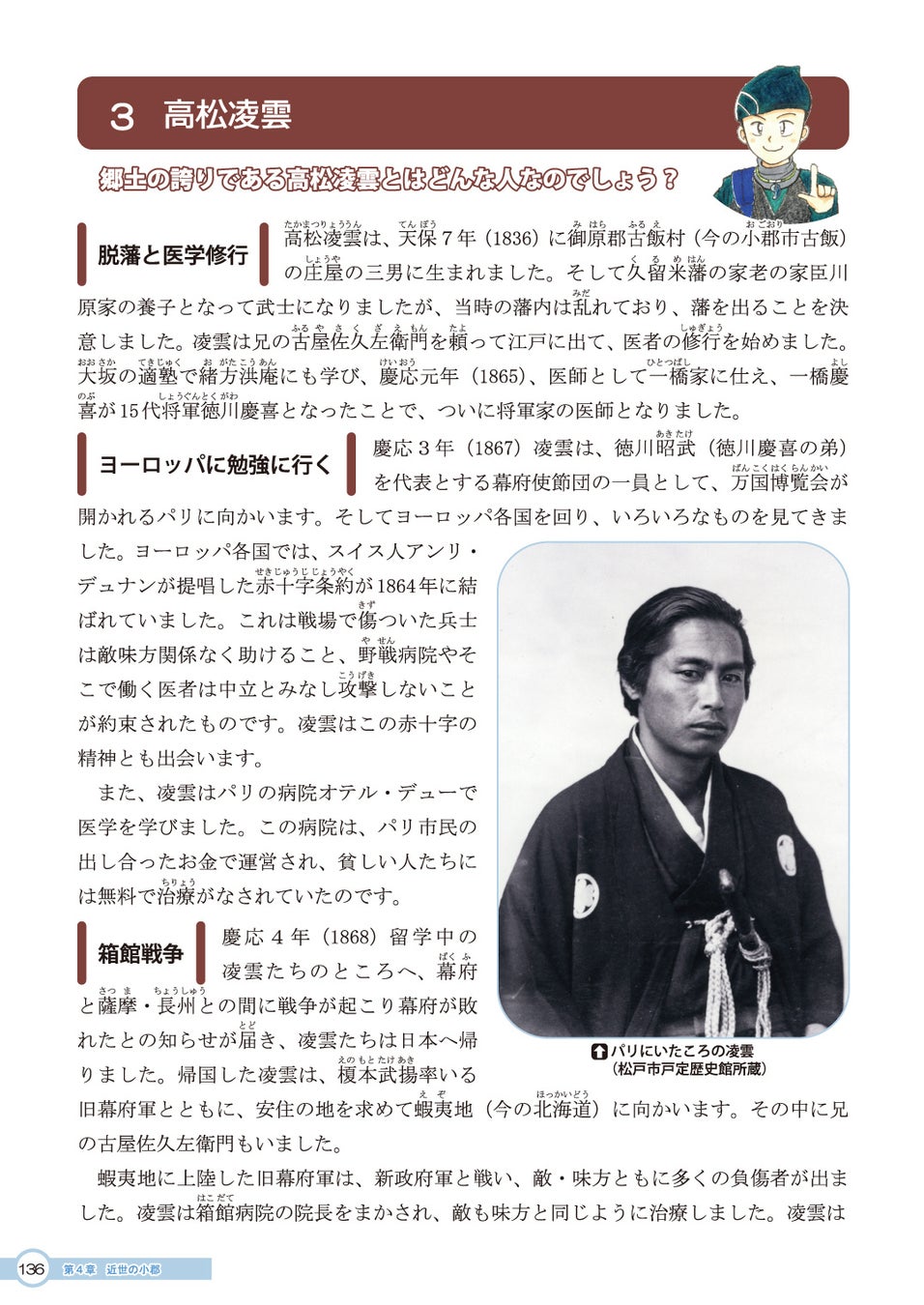 小郡市古飯に生まれ高松凌雲(たかまつ りょううん)は、幕府軍の医師として従軍した箱館(函館)戦争で敵味方の区別なく治療にあたるなど、近代日本において医療と博愛の精神を体現した医師で、医学校や病院を設けた近代救護の先駆者です。