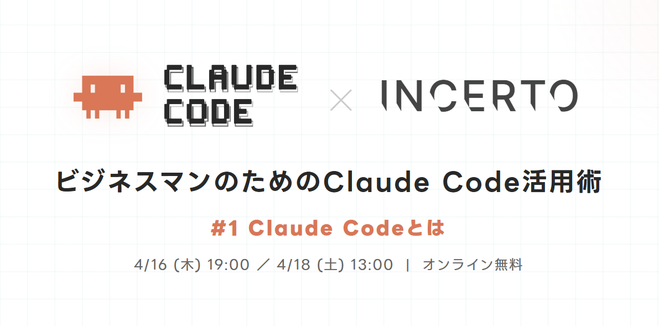 第1回は「ビジネスマンのためのClaude Code活用術 #1」として、2026年4月16日(木)19:00〜21:00と4月18日(土)13:00〜14:00 の2日程でオンライン(Google Meet)にて無料開催します。