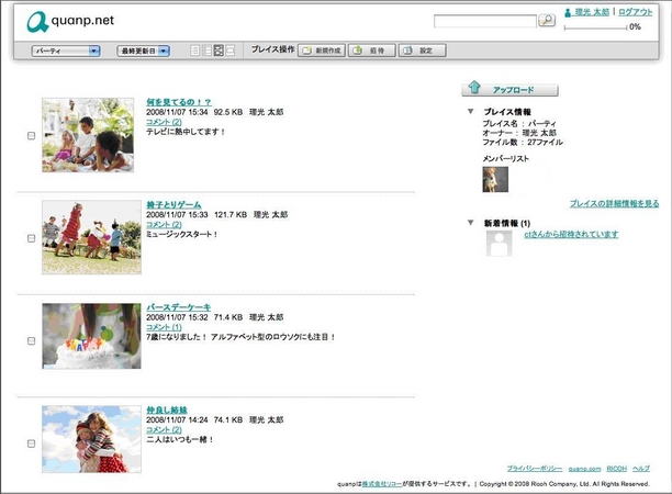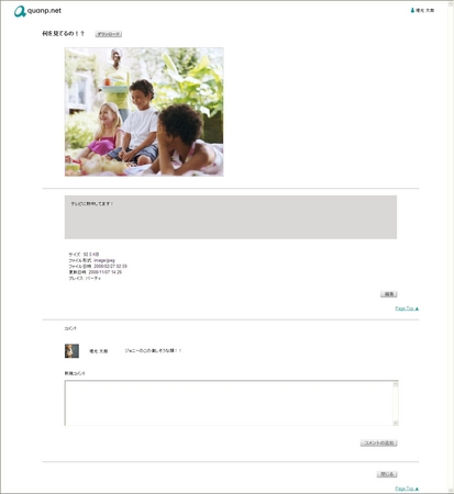 quanpは、デジタルカメラで撮影した画像やパソコンで作成した文書、音楽ファイルなど、さまざまな情報を簡単な操作でWeb上にアップロードし、活用するためのWebサービスです。Microsoft Officeアプリケーションから直接ファイルのアップロード/ダウンロードを可能にする「quanp Add-in for Microsoft® Office 2003/2007」やデスクトップ上に画像をスライドショー表示するウィジェット「quanp slideshow」など、順次機能を拡充しています。