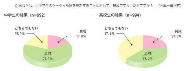 「あなたは、小中学生のケータイ所持を規制することに対して、賛成ですか、反対ですか?」といった質問に対し、「賛成」と答えた女子高生は23.0%、当事者の女子中学生でも17.8%でした。