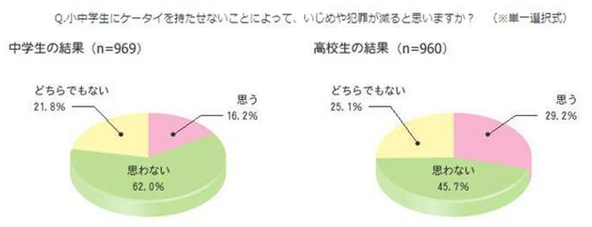 「小中学生にケータイを持たせないことによって、いじめや犯罪が減ると思いますか?」という質問に対し、女子高生の45.7%、女子中学生では62.0%が「思わない」と回答しました。上述にて紹介したように、条例に対して反対意見ばかりではありませんが、そのような条例での規制だけでは、根本的な問題は解決されないという厳しい意見もあるようです。