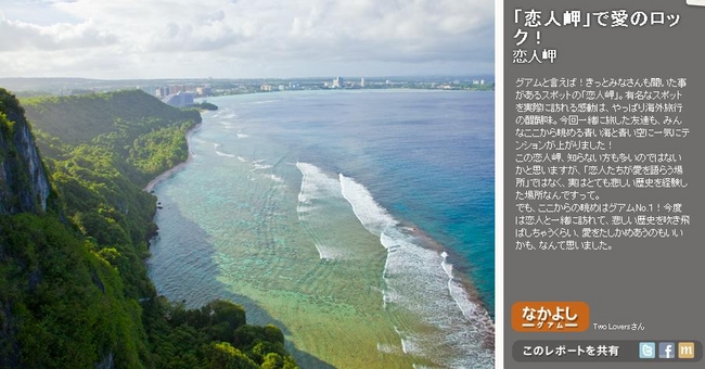 グアム政府観光局のホームページでは、既に第1期当選者の方々の体験レポートがアップされており、テーマやアクティビティーのカテゴリごとにモニターレポートを見ることが出来ます。