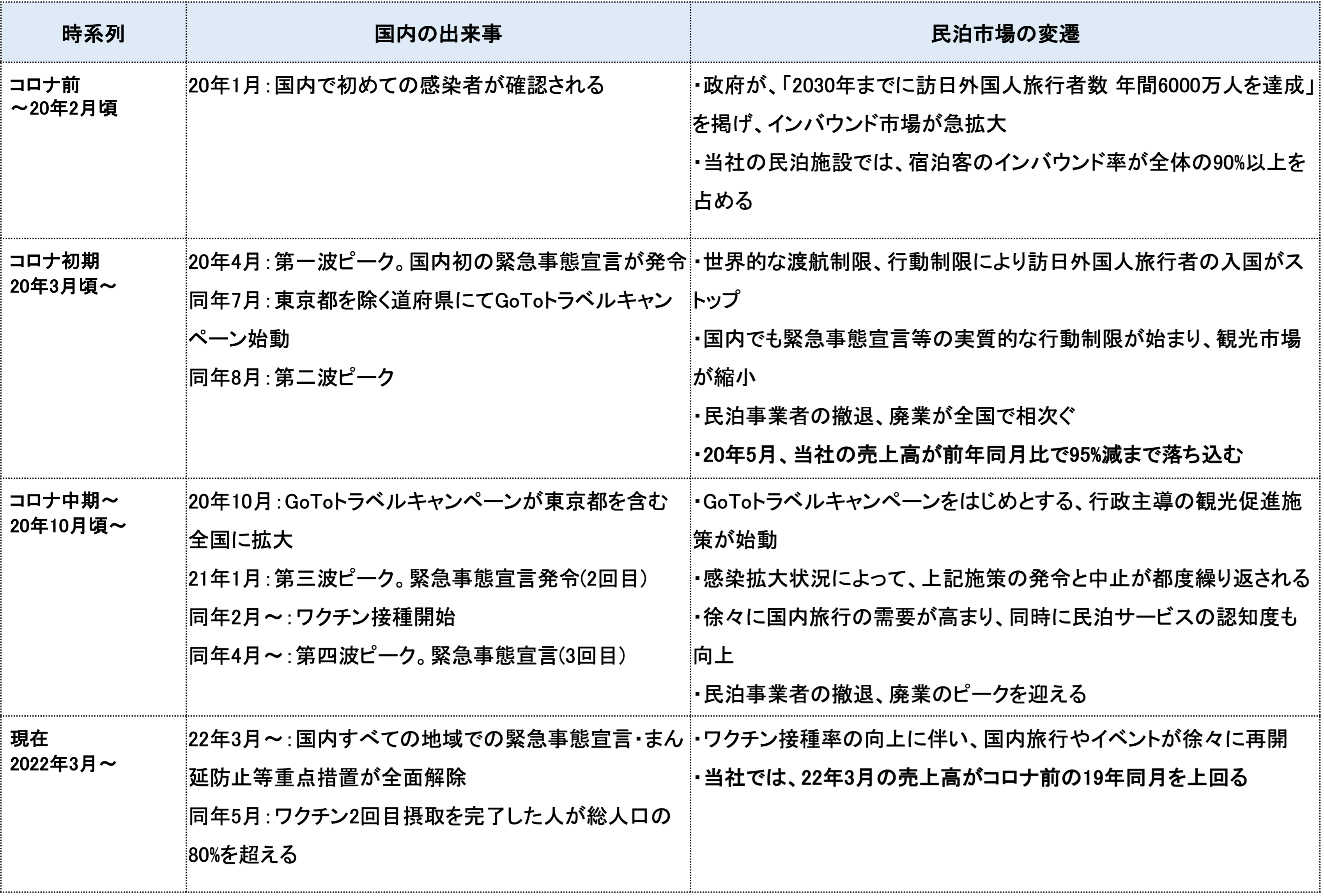 新型コロナウイルスの感染拡大初期から現在に至るまで、国内の民泊市場は官公庁や行政が発令する緊急事態宣言やまん延防止等重点措置、GoToトラベルキャンペーンをはじめとする各自治体の観光促進キャンペーン等の様々な施策に影響を受けてきました。