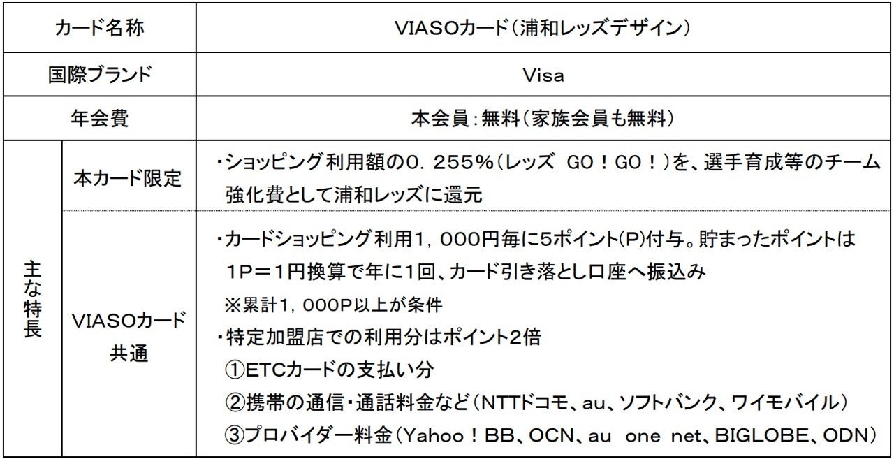 ・「VIASOカード(浦和レッズデザイン)」は、浦和レッドダイヤモンズ株式会社との提携により2014年1月から発行。ショッピング利用額の一部を浦和レッズのチーム強化費に充当する、浦和レッズファンのためのカード。