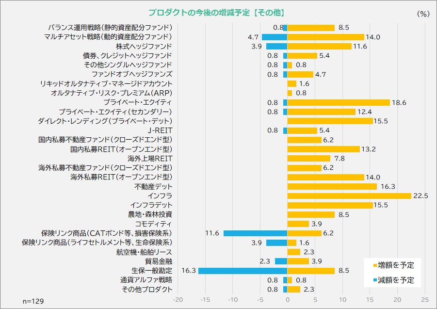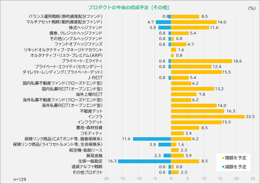 - 債券・クレジット系プロダクトでは国内債券の減額予定が目立つほか、金利上昇、為替ヘッジコストが影響してヘッジ外債の投資ニーズが減衰しています。一方で、アクティブ運用や債券アンコンストレインド運用については根強いニーズも確認できました。
