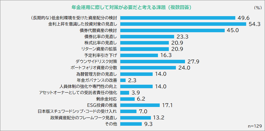 - 年金運用上の課題では、「足もとの金利上昇」「長期的な低金利」「ダウンサイドリスク」への対策が上位に(下図参照)。「足もとの金利上昇」「長期的な低金利」の両方を選択する企業年金も多く、低金利にともなう利回り低下と、金利上昇による債券価格下落の板挟みの状態にあるようです。