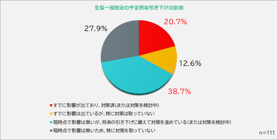 - 相次ぐ生保一般勘定の予定利率引下げの動きに対して、全体の16.3%が今後の減額・解約を予定していると回答しました。また、一般勘定を採用する企業年金の59.4%では現在何らかの対策が進んでいます。