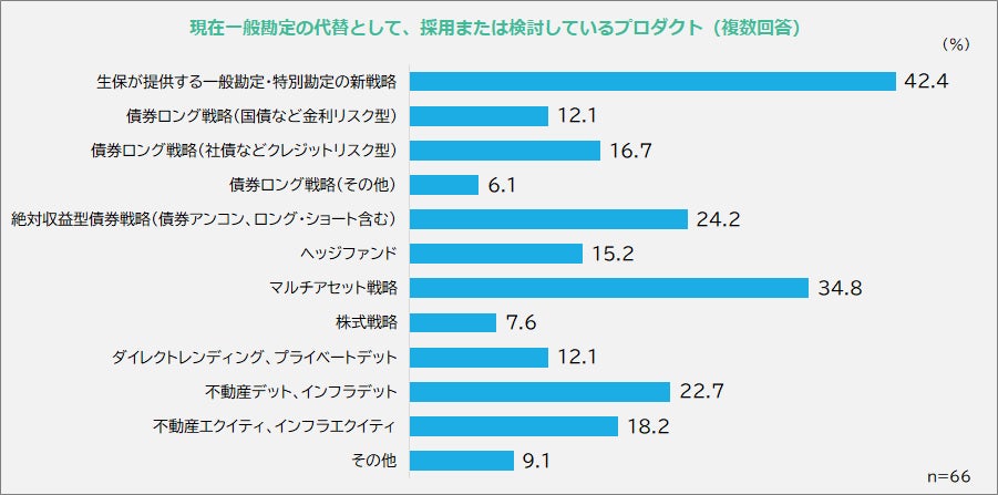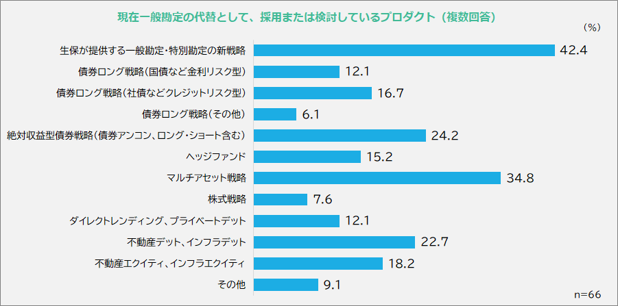 - 生保一般勘定を代替する選択肢としては、生保が提供する代替戦略、マルチアセット戦略、債券アンコンストレインド戦略、不動産・インフラのデット戦略などが検討されています。