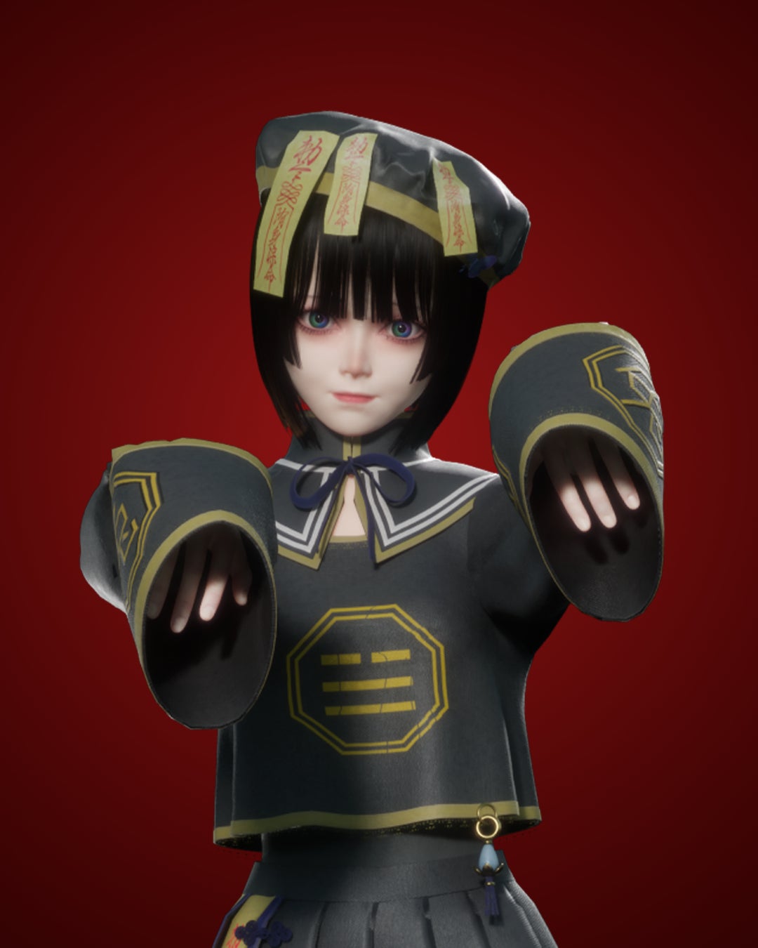 青白い肌、額にはお札。"キョンシー"の姿をまといながら、じっとこちらを見つめている。