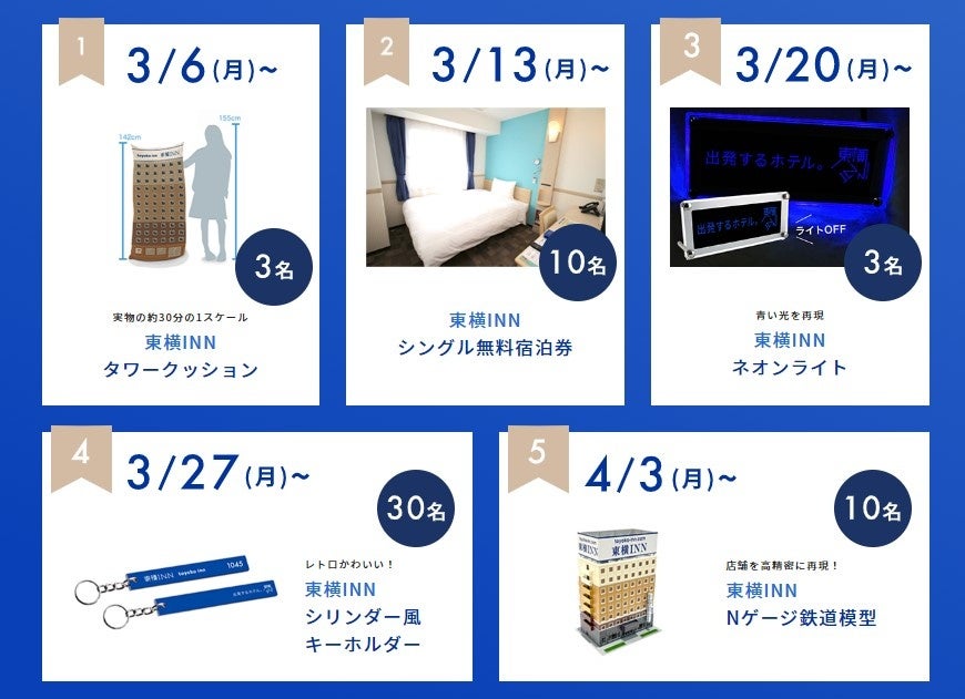 ◇第2週:3/13(月)~3/19(日)東横INNシングル無料宿泊券(10名様)