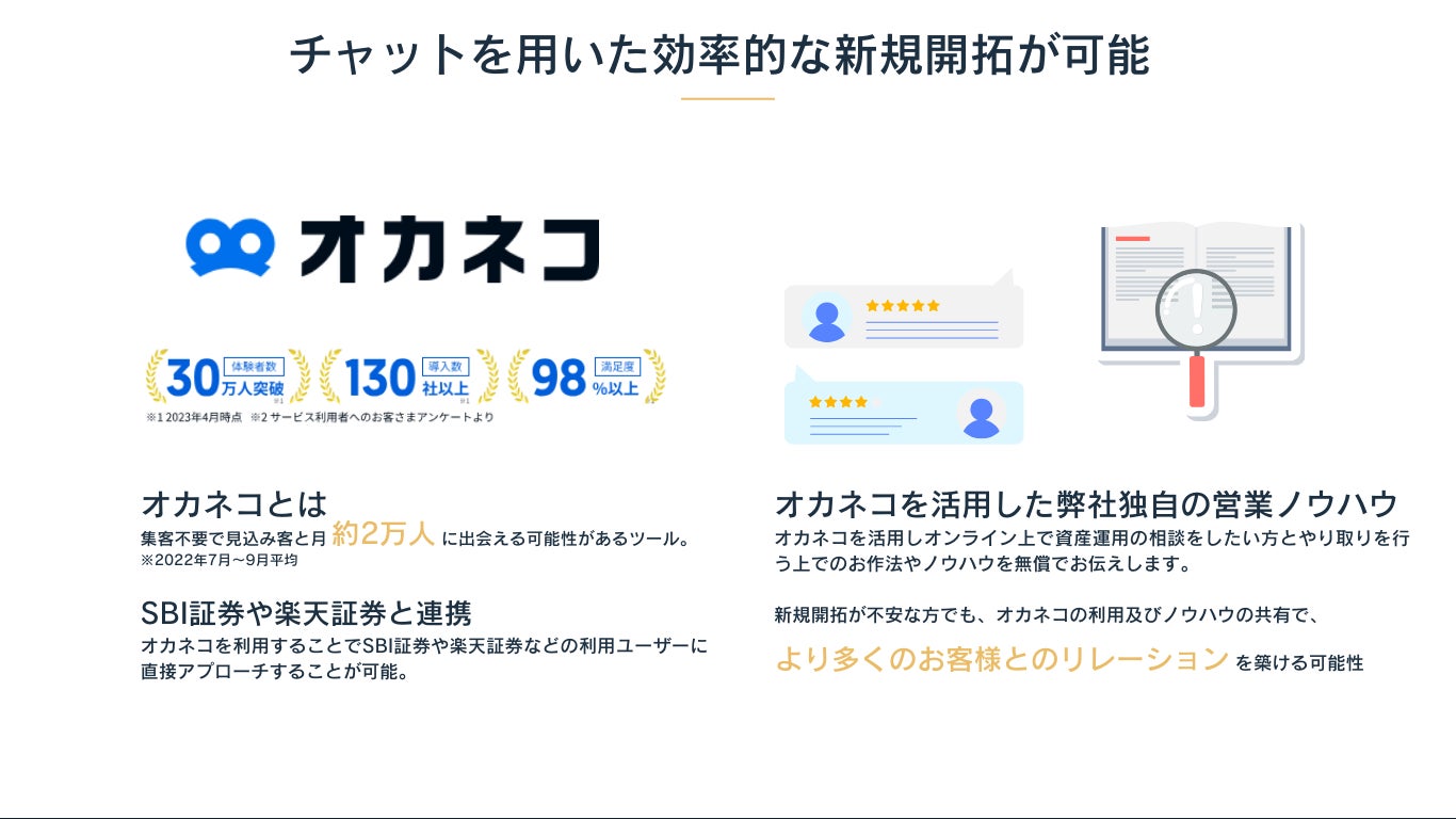 ※1:オカネコとは、集客不要で見込み客と出会える可能性があるツール。オカネコを利用するとSBI証券や楽天証券などの利用ユーザーに直接アプローチすることができ、効率的な新規開拓が可能となります。
