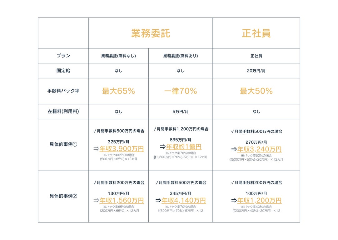 通常、IFA業界ではおおよそ在籍料4万円/月~10万円/月がかかるところを、当社では在籍料ゼロという制度を導入しております。