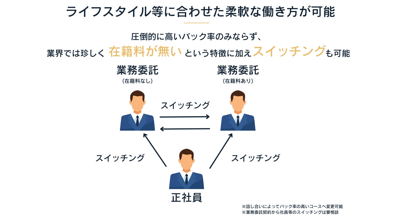 正社員から業務委託へのコース変更だけではなく、在籍料無しから在籍料ありのコースへの変更も可能となっております。収入を上げたい場合は在籍料ありへのスイッチングが出来るという制度となっております。