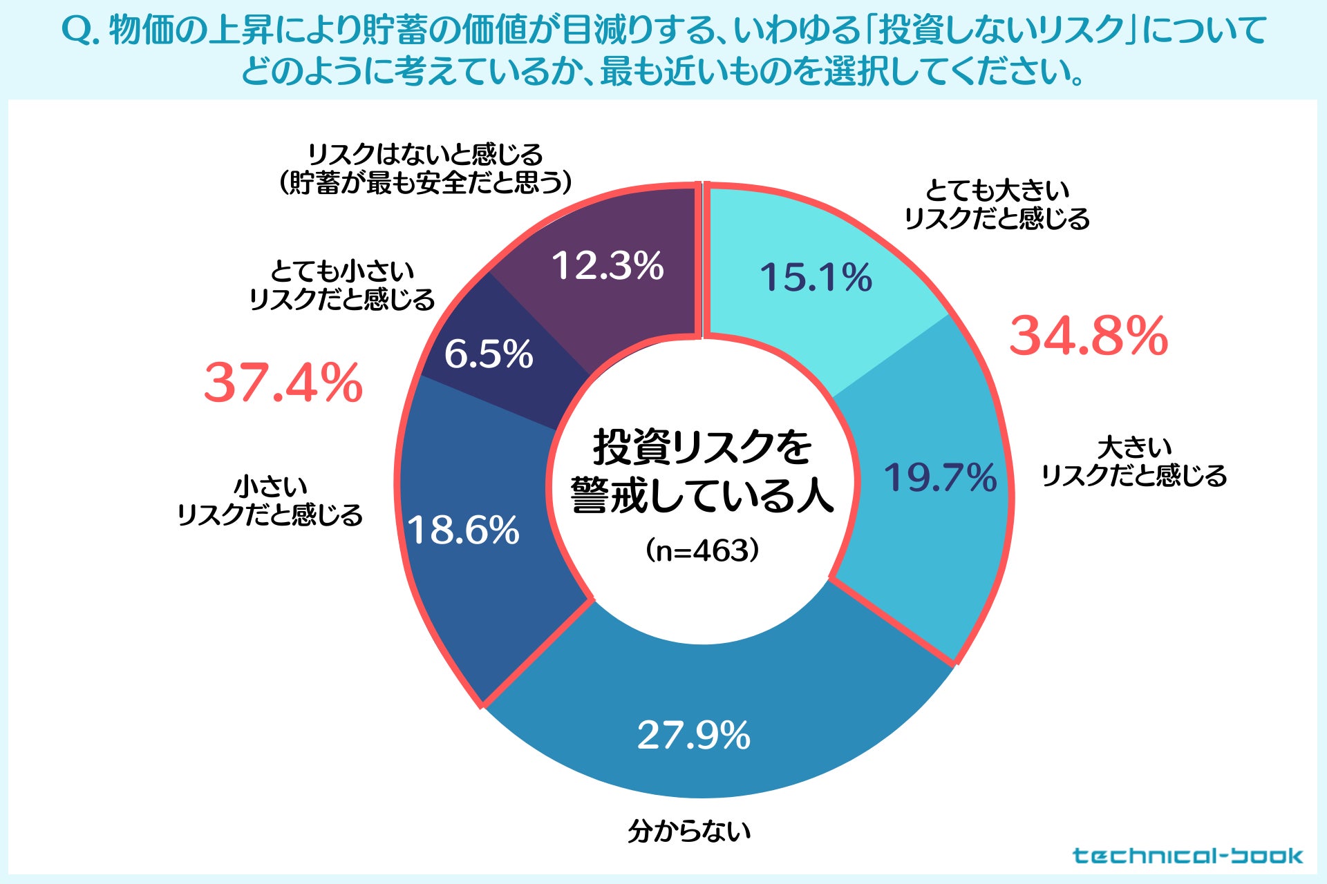 投資していない理由について「資産を増やす必要がないから」と回答した人について、投資しないリスクに関する質問を集計してみると、「とても大きいリスクだと感じる/大きいリスクだと感じる」は34.8%、「とても小さいリスクだと感じる/小さいリスクだと感じる/リスクはないと感じる(貯蓄が最も安全だと思う)」は37.4%となりました。