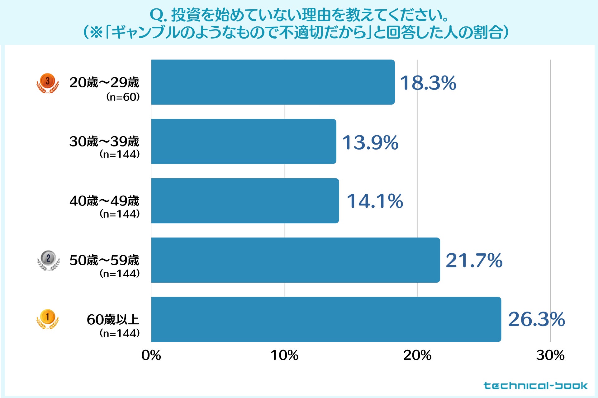 投資していない理由について「ギャンブルのようなもので不適切だから」と回答した人を年代別に集計してみると、1位は「60歳以上」の26.3%、2位は「50歳~59歳」の21.7%、3位は「20~29歳」の18.3%となりました。「投資 = ギャンブル」と捉える人は、年代別にみると年配層に多いといえるでしょう。
