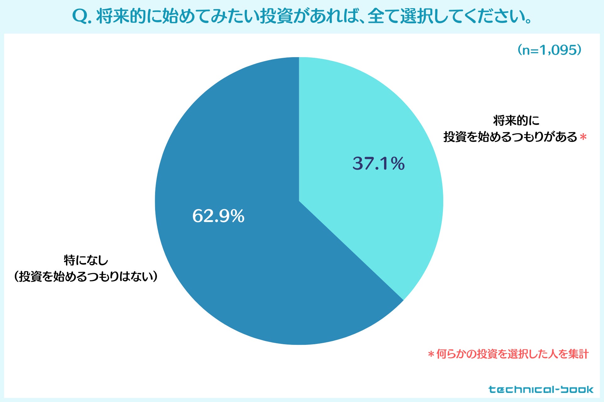将来的に始めてみたい投資について質問したところ、何らかの回答をした人は37.1%、「特になし(投資を始めるつもりはない)」と回答した人は62.9%でした。