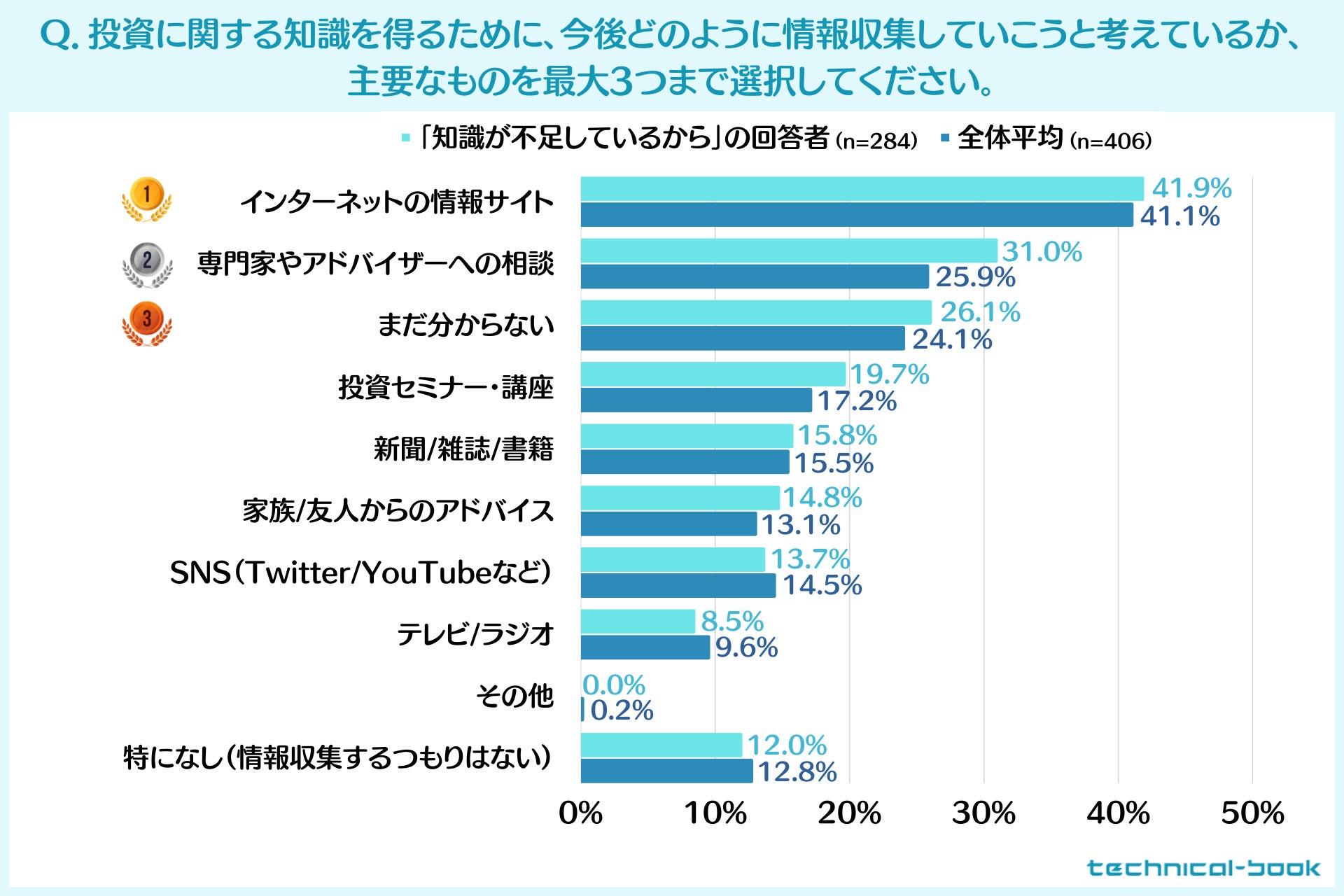 なお、投資していない理由として「知識が不足している」と回答した人で集計しても、1位は「インターネットの情報サイト」の41.9%、2位は「専門家やアドバイザーへの相談」の31.0%、3位は「まだ分からない」の26.1%と、全体平均とほぼ同様の結果となっています。