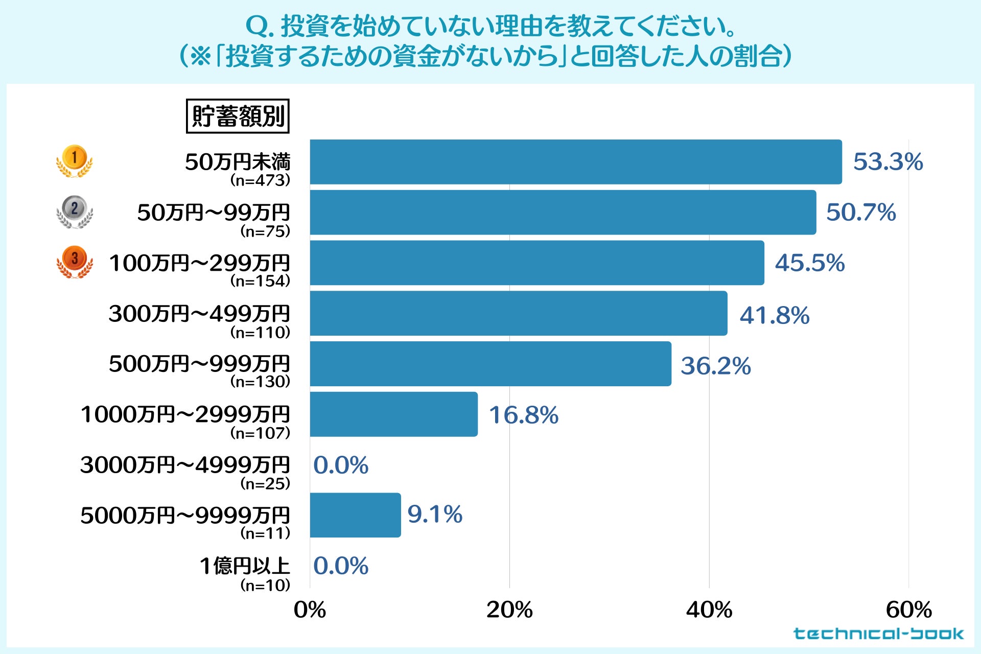 投資を始めていない理由について「投資するための資金がないから」と回答した人を貯蓄額別に集計してみると、1位は「50万円未満」の53.3%、2位は「50万円~99万円」の50.7%、3位は「100万円~299万円」の45.5%となりました。基本的には貯蓄額が増加するにつれて、割合が減っていく形となっています。