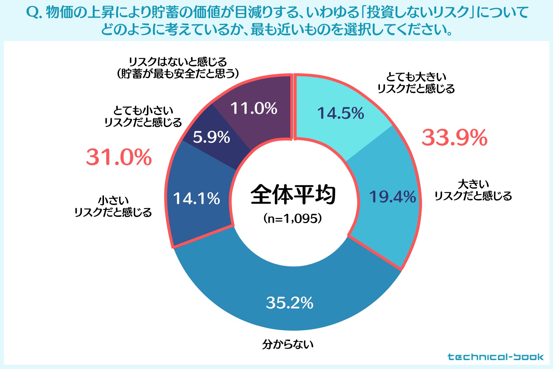 物価の上昇により貯蓄の価値が目減りする「投資しないリスク」に関する認識を質問したところ、最も多かったのは「分からない」の35.2%でした。一方、「とても大きいリスクだと感じる/大きいリスクだと感じる」は33.9%、「とても小さいリスクだと感じる/小さいリスクだと感じる/リスクはないと感じる(貯蓄が最も安全だと思う)」は31.0%となっています。