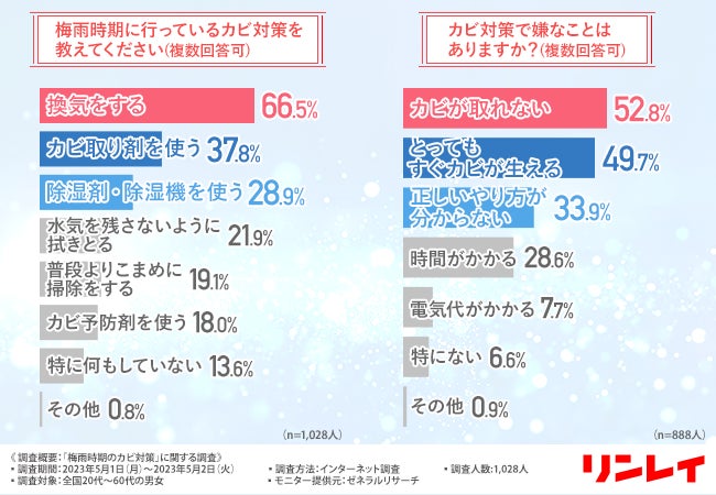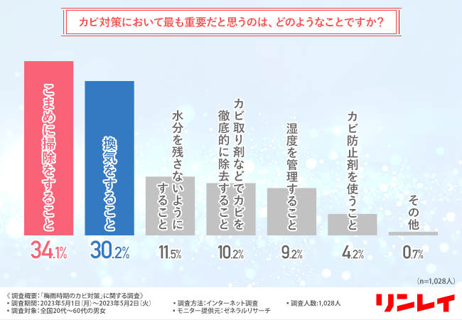 梅雨時期のカビ対策で最も多かったのは「換気をする」の66.5%となり、他にも、「カビ取り剤を使う」「除湿剤・除湿機を使う」といった“湿気”対策を行っている人が多いようです。
