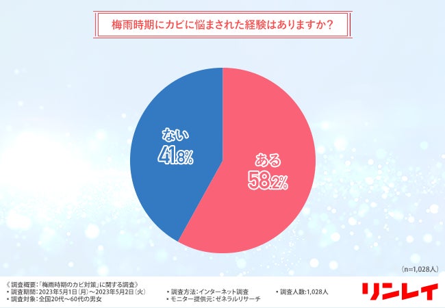 その結果、全国20代~60代の男女の6割近く(58.2%)がカビに悩まされた経験があることが分かりました。