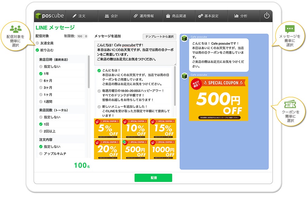 「poscubeモバイルオーダーLINEミニアプリ」で取得したお客様の「来店日時」や「来店回数」、「注文内容」から配信対象の絞り込みが可能です。絞り込んだ対象に合わせたメッセージを送ることで、リピート率を向上させることができます。