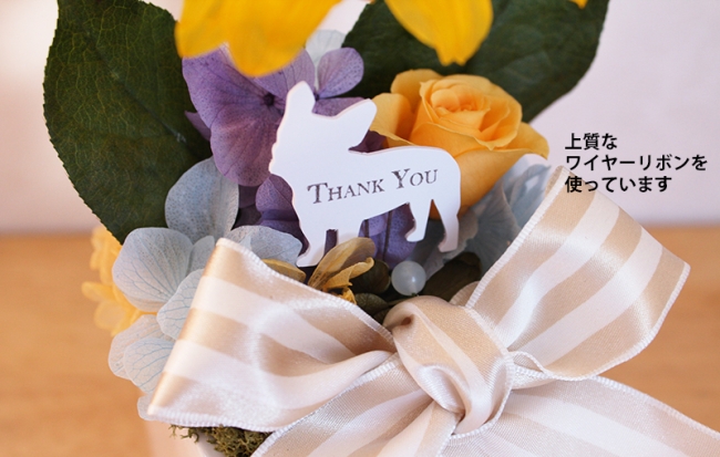 このアレンジメントにはアクリル製のメッセージプレートを付けていますが、ゴールデンレトリバーやチワワ、猫などから選べるかわいい動物やハート形のアクリルプレートは熟練職人が手作業で制作したもの。プレートに刻印する「ThankYou」「ありがとう」といったメッセージは、ひとつひとつスタンプを押して手作りにこだわっています。