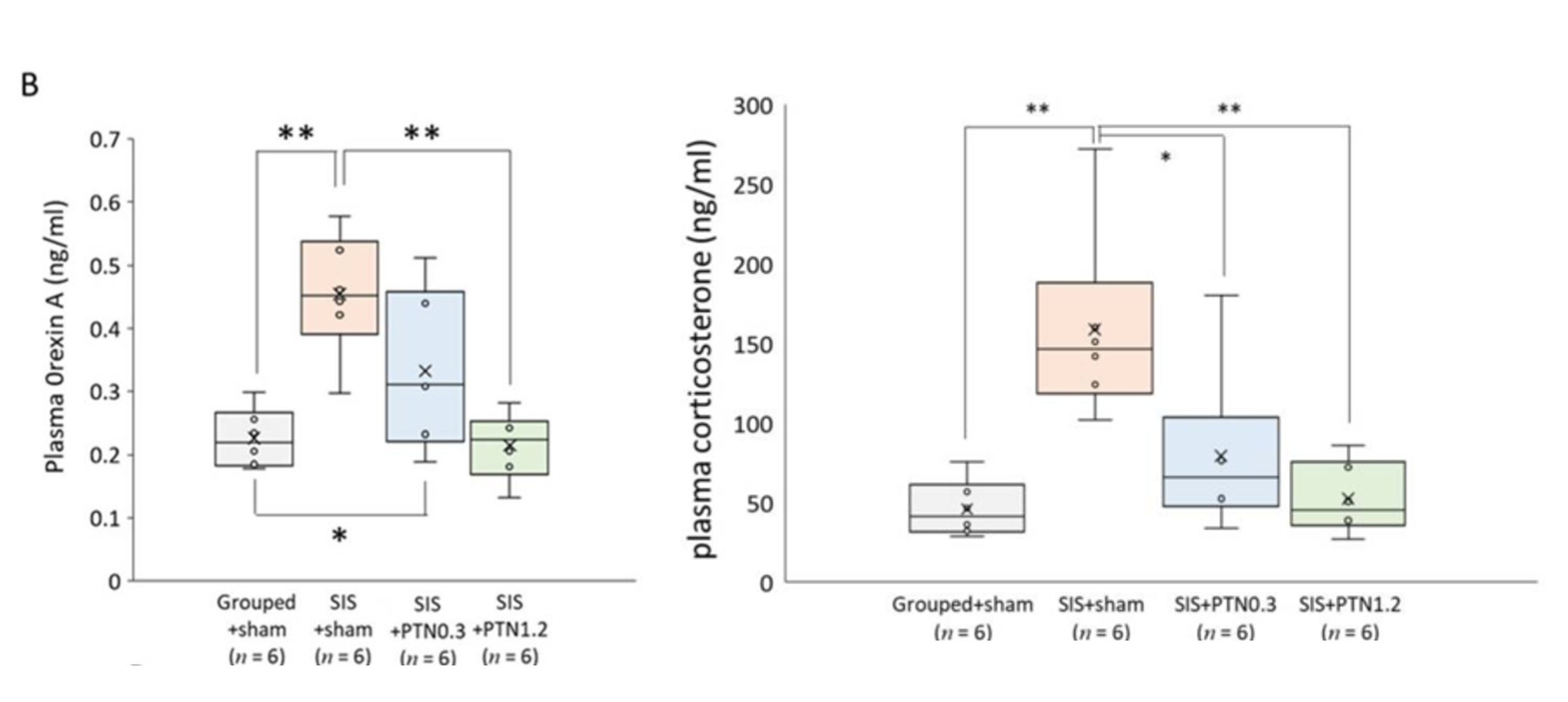 | 【円皮鍼の抗ストレス作用におけるオレキシンの制御】(上記図) 社会的孤立ストレスを与えたラットに円皮鍼を貼付したとろ、 ストレスホルモンであるコルチコステロンおよびオレキシンの低下が見られました。これらの結果により、円皮鍼がストレス反応の抑制に関与しているということを発見しました。 Fujiwara, Aki et al. “Regulatory Role of Orexin in the Antistress Effect of "Press Tack Needle" Acupuncture Treatment.” Healthcare (Basel, Switzerland) vol. 9,5 503. 27 Apr. 2021 https://www.ncbi.nlm.nih.gov/pmc/articles/PMC8146164/ |