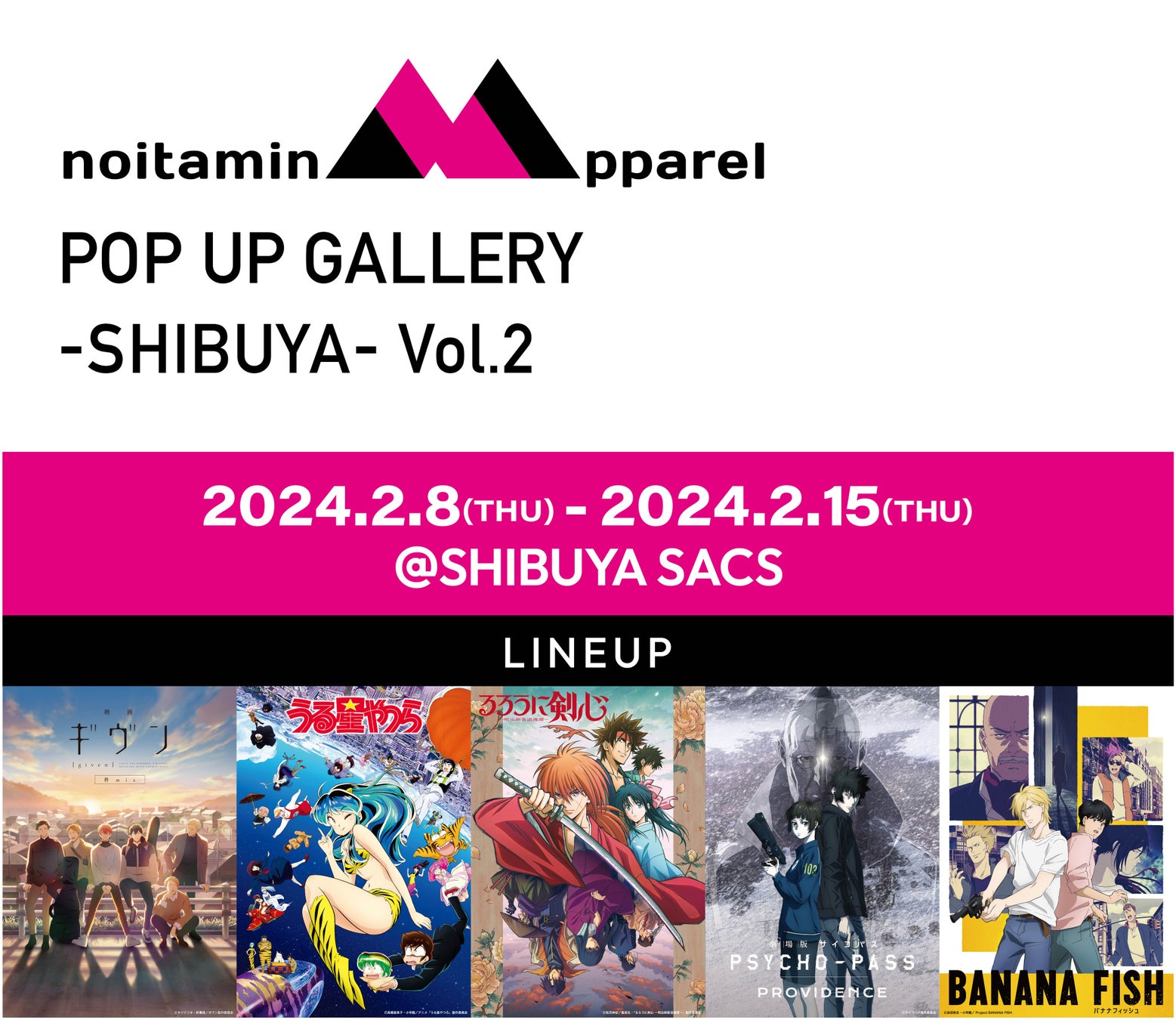 フジテレビ深夜アニメ枠“ノイタミナ”から生まれたアパレルブランド「ノイタミナアパレル」を運営するバナナスピリッツ株式会社(本社:東京都港区 代表取締役:米山博)は、アニメ『ギヴン』シリーズ、『PSYCHO-PASS サイコパス』シリーズなど“ノイタミナ”作品のアパレル雑貨を中心としたECサイトと連携するリアル店舗(ノイタミナアパレル POP UP ギャラリー)を、期間限定で渋谷にオープンいたします。