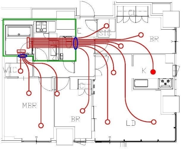 ヘッダー工法では水回りの遮音壁を貫通させる配管が多いため貫通部の遮音処理に多くの時間を要しておりましたが、本工法ではループ状にした主配管の2箇所だけのため、貫通部処理の省力化が可能となります。