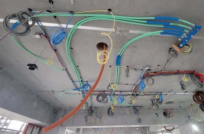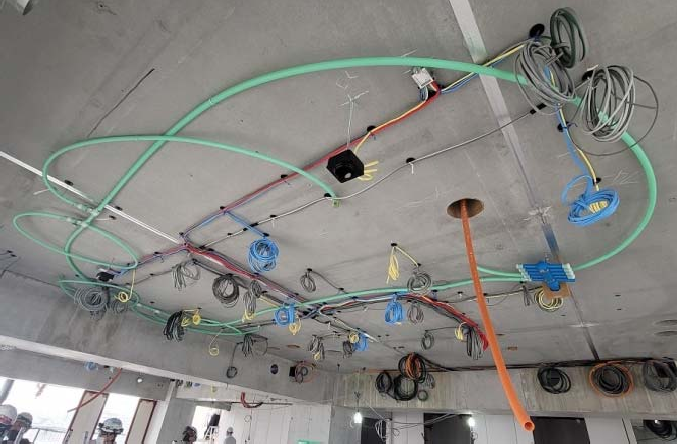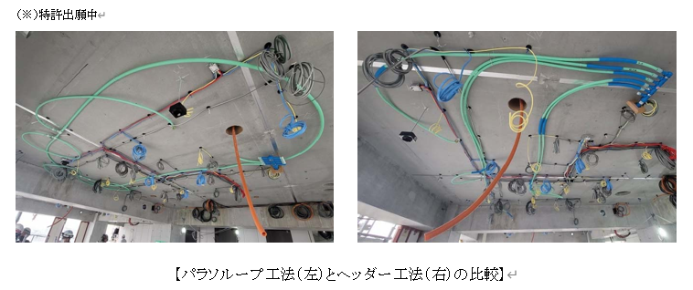 本工法は、天井スラブ面に敷設するスプリンクラーの主配管をループ状にするもので、在来工法(ヘッダー工法)と比べて配管長を約40%削減し、敷設作業の省力化により生産性が約20%向上しました。
