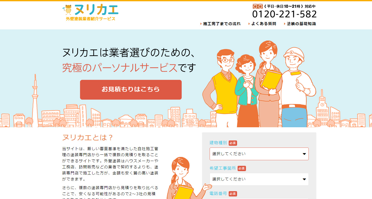 「ヌリカエ」は、そんなユーザーに寄り添う形でのサービスとして、サイト上での情報提供だけでなく、物件の詳細状況を専門アドバイザーが直接ヒアリングした上で、400社を超える加盟企業の中から、一人一人に合ったベストな外装リフォーム会社を紹介するサービスを提供してまいりました。