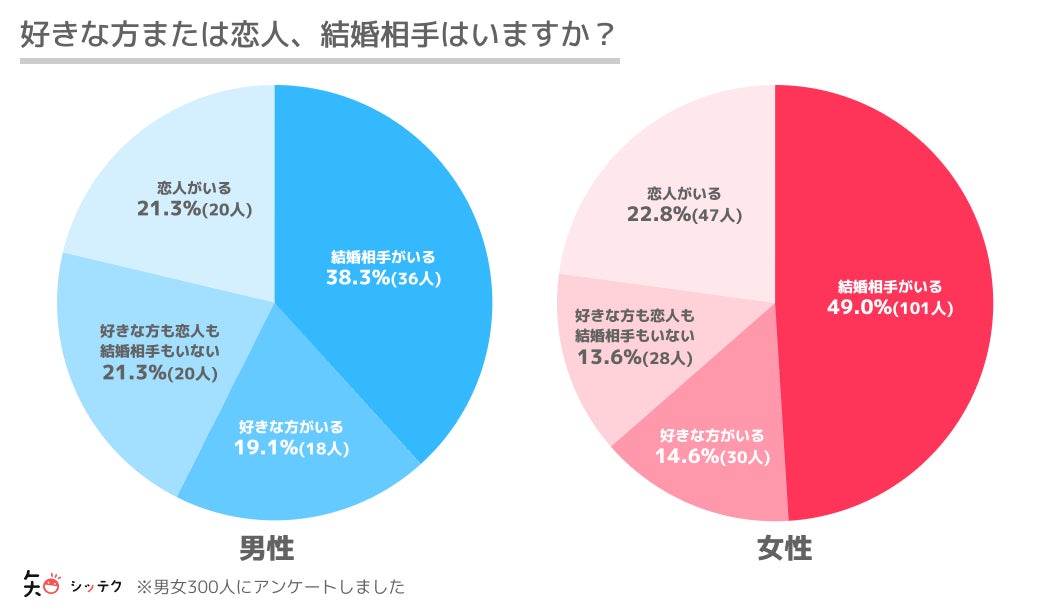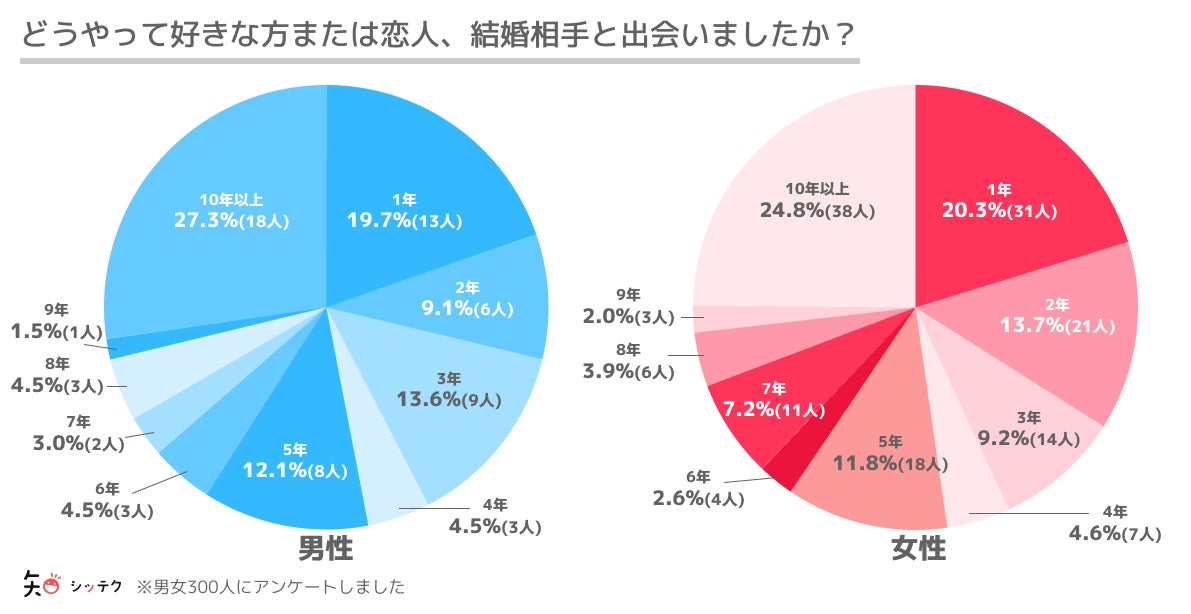 「どうやって好きな方または恋人、結婚相手と出会いましたか」の質問では、男性は「昔からの友人」が「職場」ともに19.1%で最多でした。