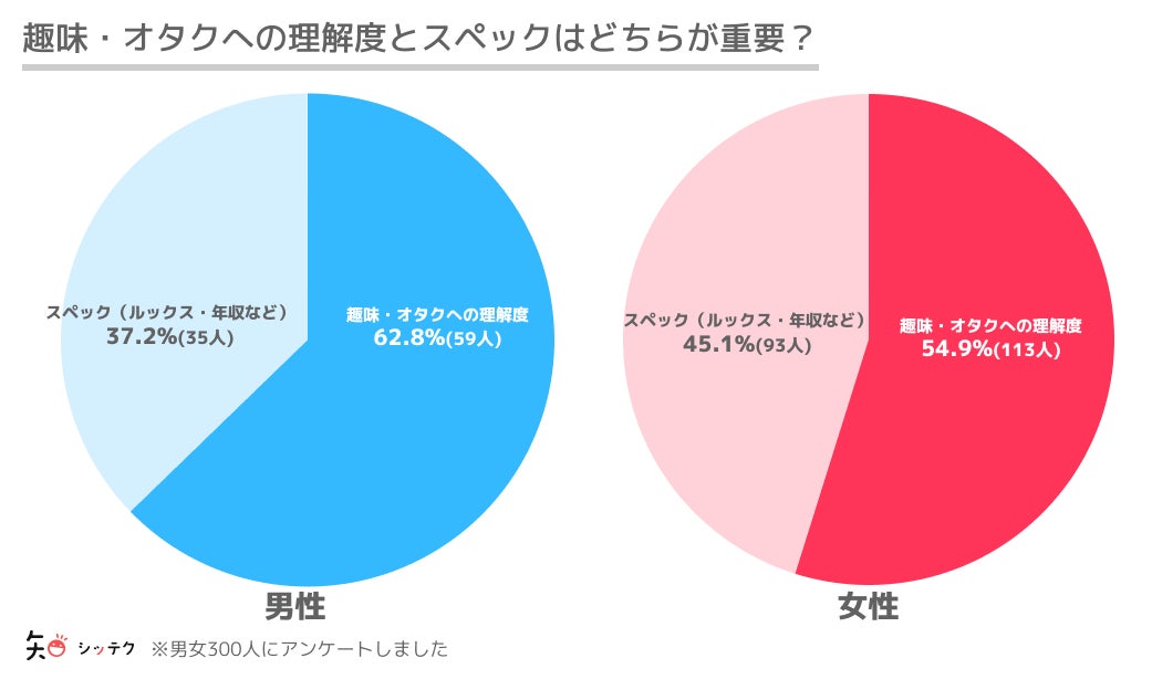 「趣味・オタクへの理解度」と「スペック(ルックス・年収など)」はどちらが重要か質問・回答を募ったところ、「オタクへの理解度」と「スペック」では男女共に「オタクへの理解度」の方が重要な傾向が見られました。