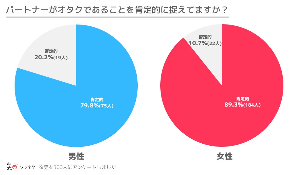 「【好きな方または恋人、結婚相手がオタクですかの質問に「はい」と答えられた方】パートナーがオタクであることを肯定的に捉えてますか。否定的に捉えてますか。」と質問・回答を募ったところ、男性79.8%、女性89.3%にて「はい」という回答が出ました。オタクの方は、相手のオタク趣味にも寛容だという事なのかもしれません。