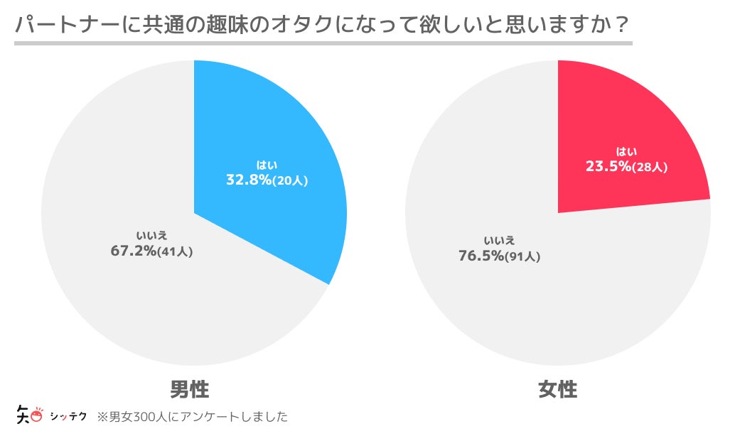 「【好きな方または恋人、結婚相手がオタクですかの質問に「いいえ」と答えられた方】パートナーに共通の趣味のオタクになって欲しいと思ってますか。」と質問・回答を募ったところ、男性67.2%、女性76.5%にて「いいえ」という回答が多い結果となりました。オタクの方は自分の趣味がある事への理解はしてほしいようですが、必ずしも共通の趣味をもってほしいわけではないようです。