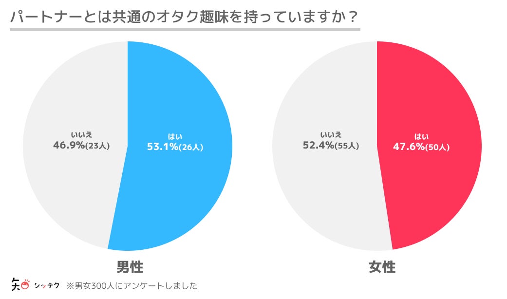 パートナーと共通のオタク趣味を持っているという方は男女共に50%程