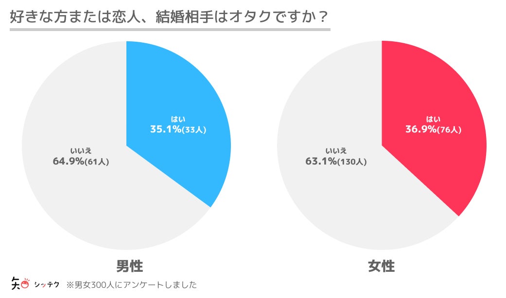 「好きな方または恋人、結婚相手はオタクですか。」と質問・回答を募ったところ、男性は「いいえ」が64.9%で、女性は「いいえ」が63.1%でした。男女ともにお相手がオタクである場合は少ないようです。