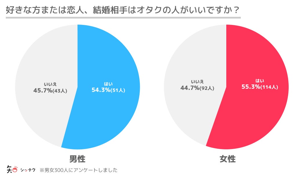 「好きな方または恋人、結婚相手はオタクの人がいいですか。 」と質問・回答を募ったところ、男性は「はい」が54.3%、「いいえ」が 45.7%で、女性は「はい」が55.3%、「いいえ」が44.7%という結果が出ておおよそ半々の結果となりました。必ずしも、オタクの方が「相手もオタクであってほしい」と願っているわけではないようです。