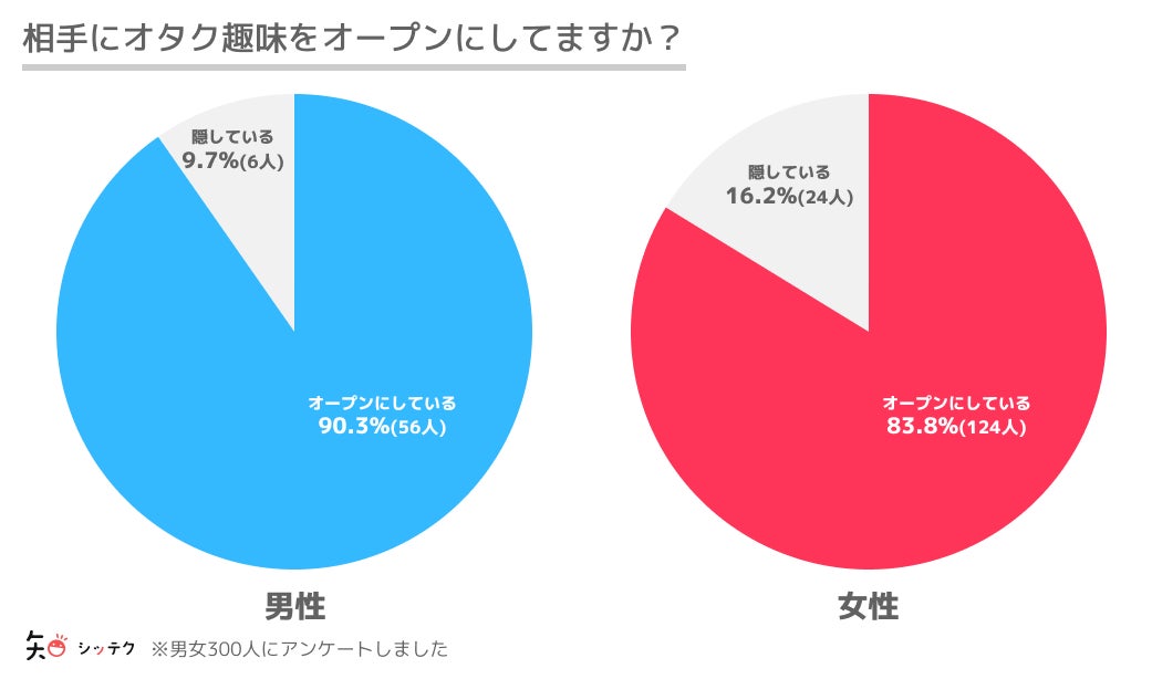 「【好きな方または恋人、結婚相手がオタクですかの質問に「いいえ」と答えられた方】相手にオタク趣味をオープンにしてますか。または隠してますか。」と質問・回答を募ったところ、男性90.3%、女性83.8%にて「はい」という回答が多い結果となりました。オタク趣味は恋愛する上で隠さない方が多いようです。